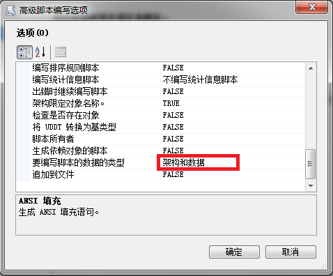 4 高级选项中最重要的一步就是在”要编写的脚本的数据类型“中选择第一项“架构和数据”,这个默认是选择“仅限架构”,这个选项只会复制数据库的表结构而不会复制数据库的具体数据。