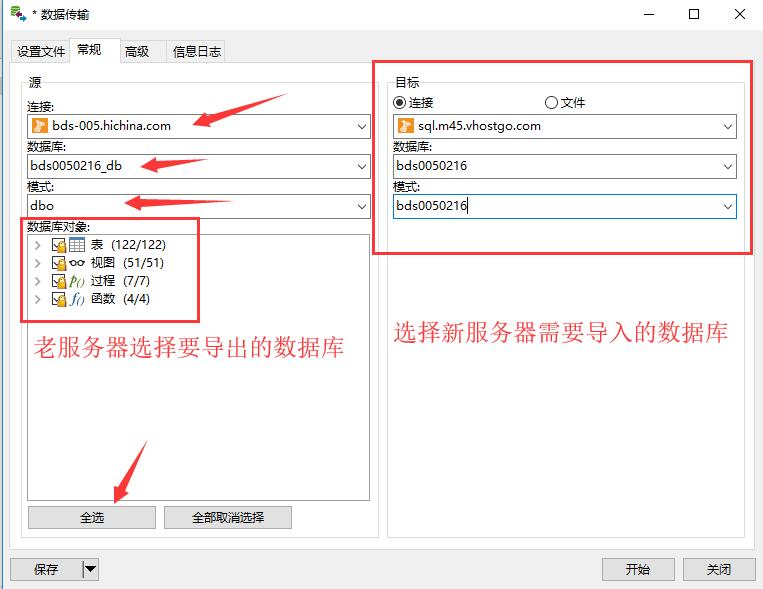 开始后工具自动从原来数据库中将所有数据导出到新数据库,请原来服务器处最好选择全选,因为可能有试图、过程、函数等需要导出,
