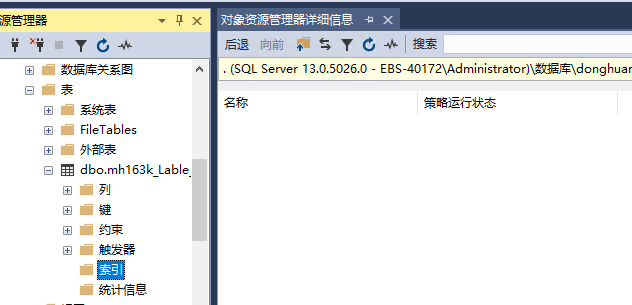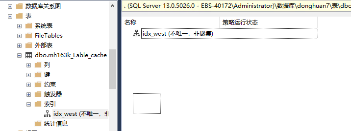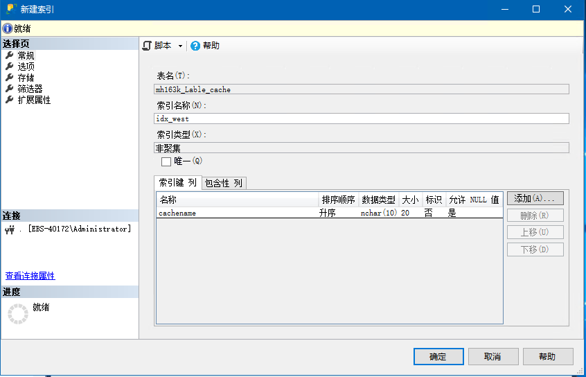 3.然后进入sqlserver管理器中,找到该数据库,表,索引,可以看到没有在cachename字段上建立索引