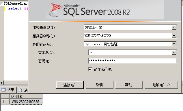 2,使用服务器名称登录数据库,不清楚服务器名称的使用下边语句查询