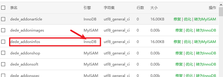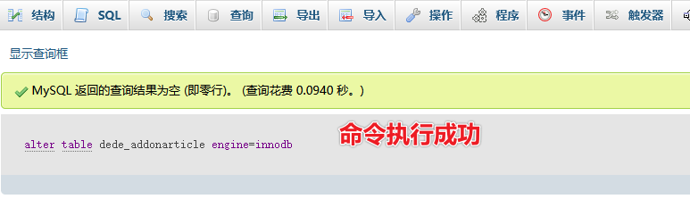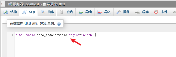 比如要将 dede_addonarticle 表 转换为 innodb 引擎,可在phpmyadmin中执行如下命令即可转换(也可使用root账号登录到mysql里面执行命令,方法很多,自行选择):