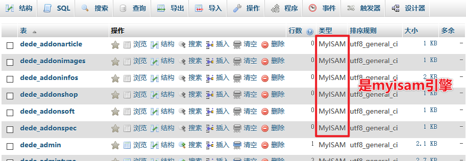 查看当前数据库表是否是innodb引擎,方法很多,我们只介绍在phpmyadmin中如何查看,其他方法请自行百度搜索。 MyISAM存储引擎转换为innodb引擎方法: