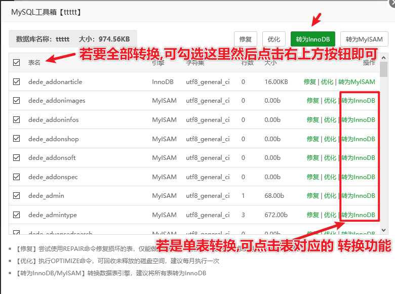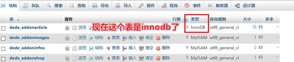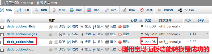 2、宝塔面板转换方法alter table dede_addonarticle engine=innodb;