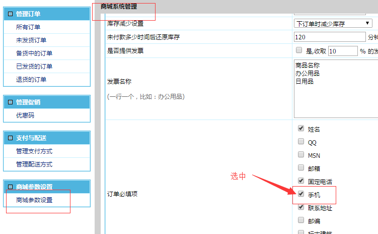五. 选择:商城系统管理 -> 商城参数设置 -> 订单必填项。