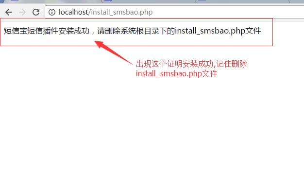 二:插件的安装:将本插件内的文件覆盖至原系统,浏览器输入:域名/install_smsbao.php安装短信宝短信插件,出现安装成功提示后请将根目录下的install_smsbao.php删除。