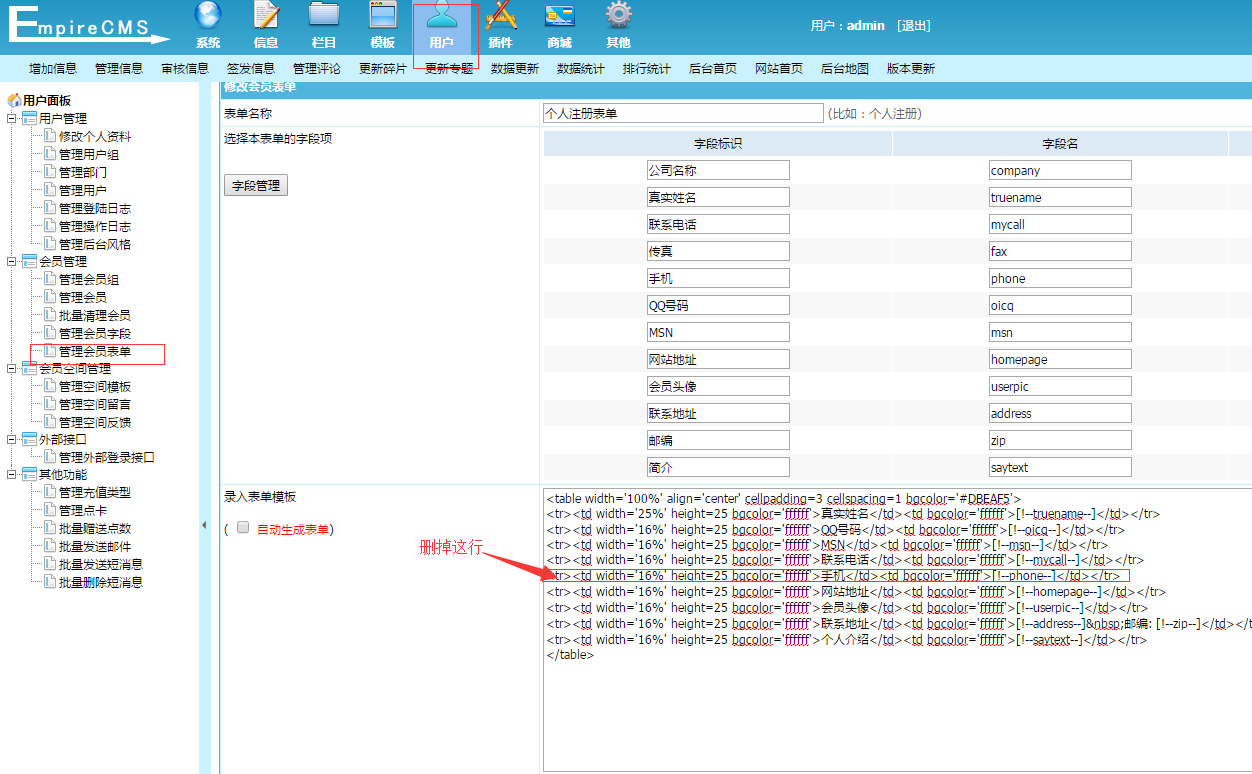 七: 修改: 后台 -> 用户 -> 会员管理 -> 管理会员表单 -> 个人注册表单 -> 修改。