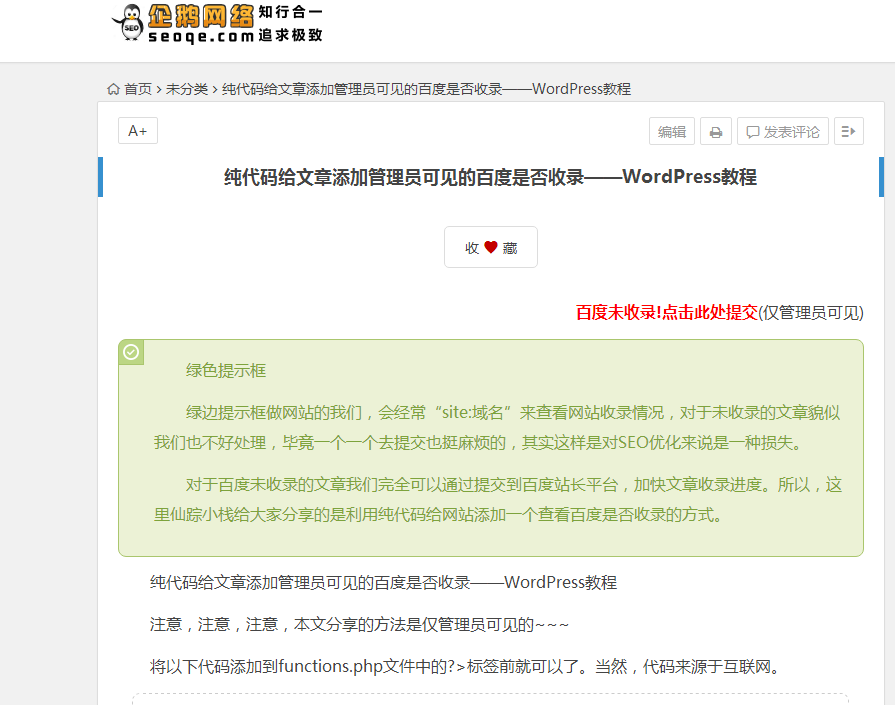 纯代码给文章添加管理员可见的百度是否收录——WordPress教程