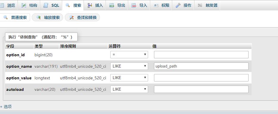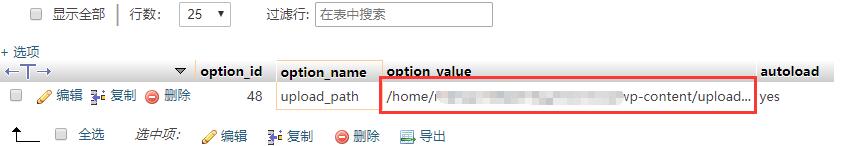 后面查看到用户升级更换了空间,所以怀疑是路径的问题,用户也安装了缓存插件,所以怀疑是缓存插件缓存了之前的路径,但是没有查到那个地方设置更改,于是利用phpmyadmin打开wp_options表,在option_name里面搜索upload_path字段