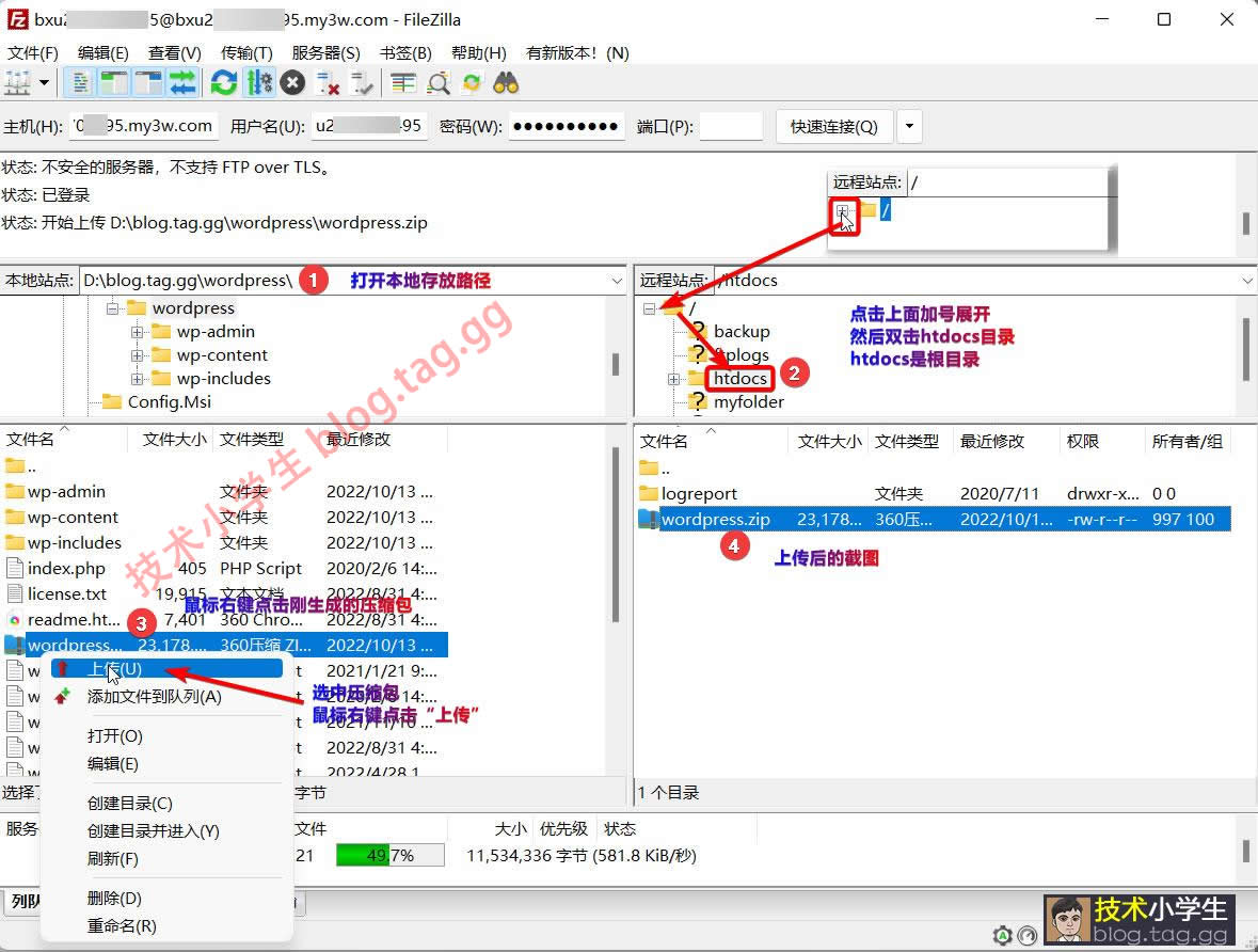 ③、如果你的右键直接又压缩为.zip格式的命令,那么直接选择压缩为zip文件就行了,如果没有压缩为zip的选项,就选择添加为压缩文件,然后在界面选择zip格式再压缩。 2、登录FTP: 3、上传压缩包 注意:若您的主机是windows系统,是没有htdocs目录的,直接上传到/根目录下即可