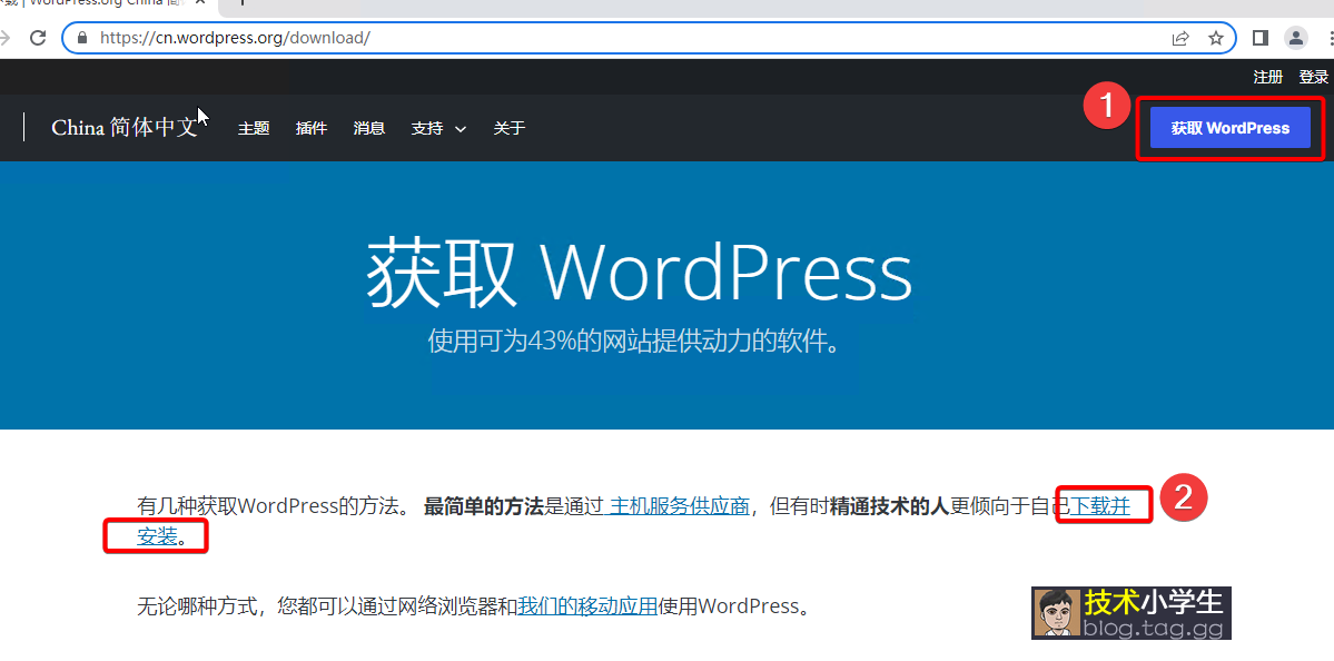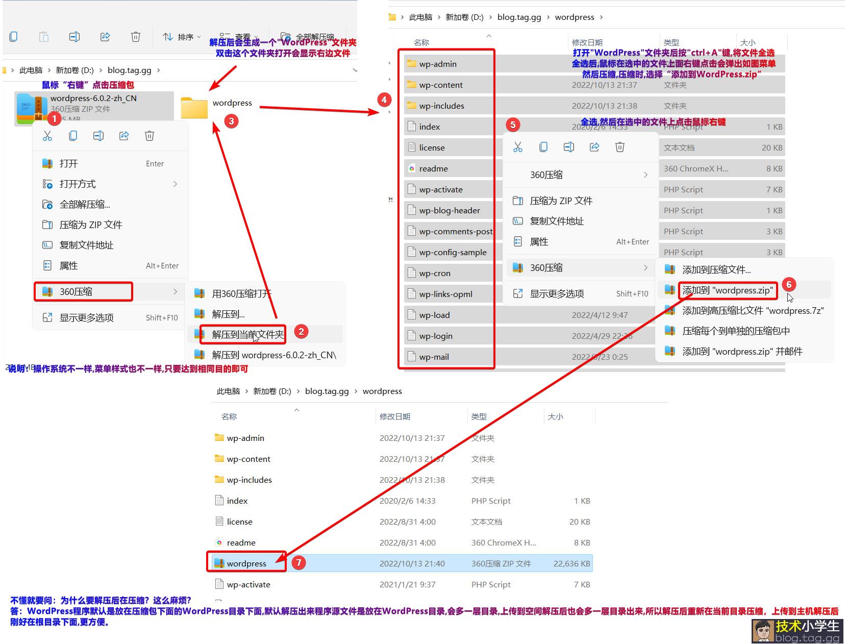 访问:https://cn.wordpress.org/download/ 点击如图下载最新版(该地址在海外,若无法打开,建议从国内其他下载站搜索下载) 下载后,我们需要重新压缩一个没有wordpress目录的压缩包,具体操作看下图步骤