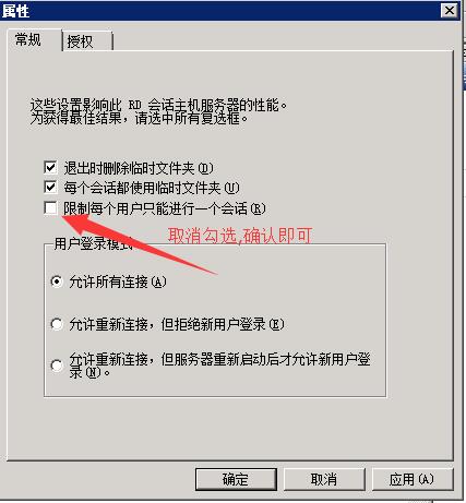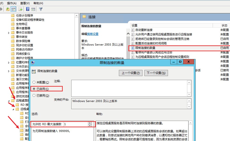 若只能一个会话登录,除开上面考虑外,还需要考虑组策略中是否有限制,如图