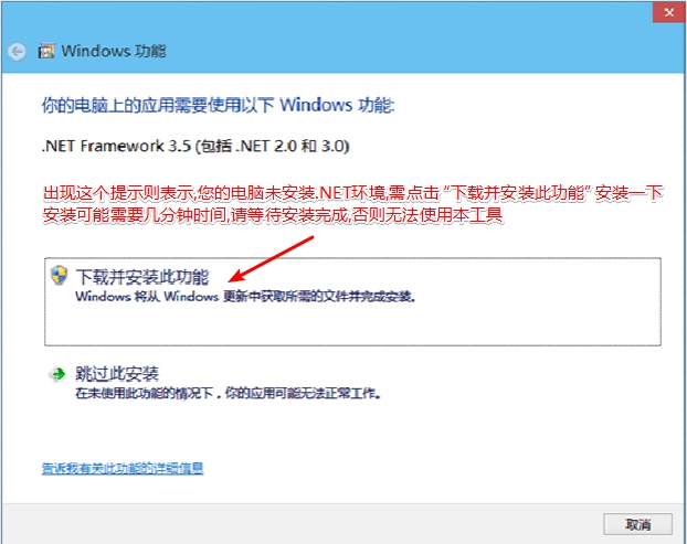 若出现如下图所示提示,则表示当前系统并未安装.NET环境,需点击 “下载并安装此功能”安装完毕后再次打开即可,