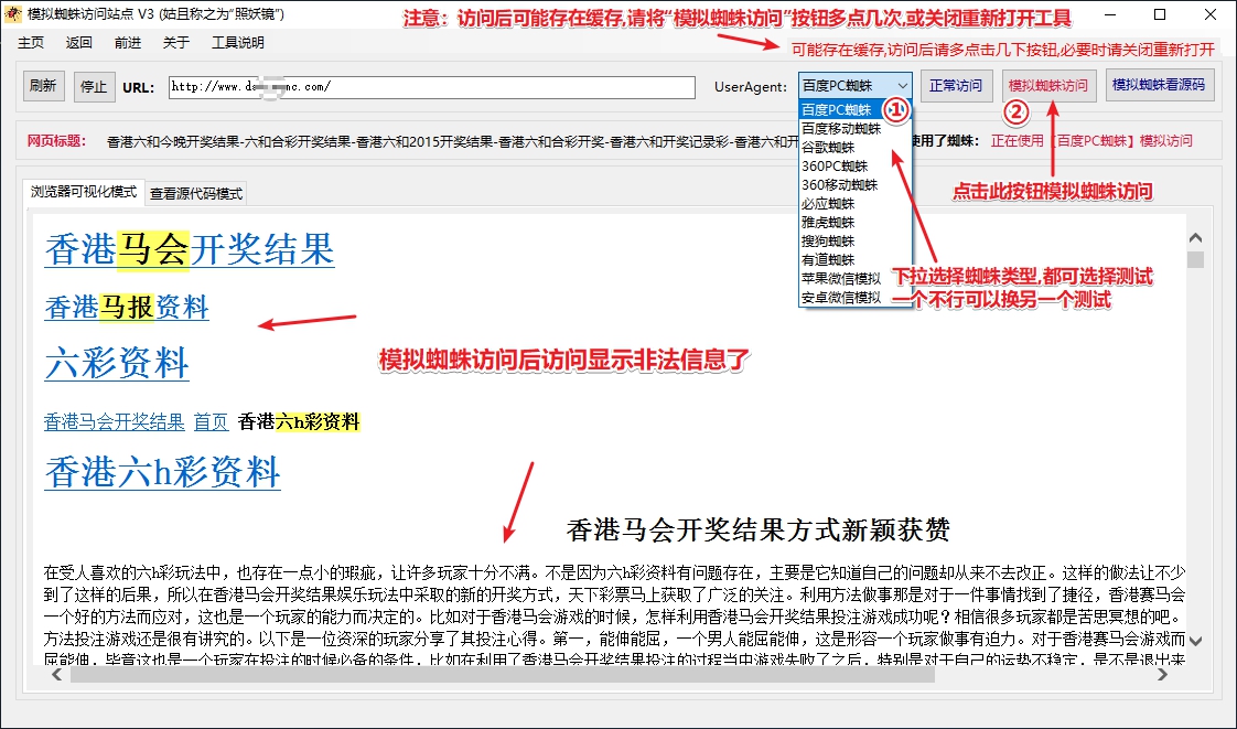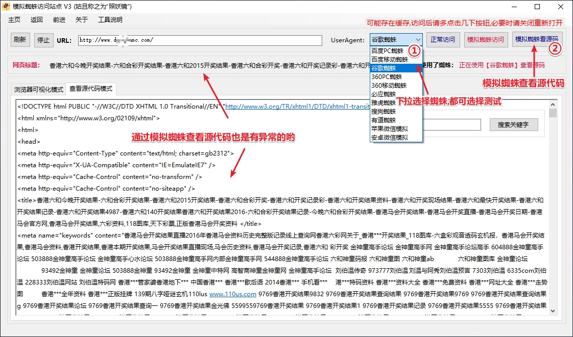 答:若确实被阻断了,非法信息都是存在的,之所以找不到这些内容,原因是黑客将代码加密了,很难查找,若要检测网站访问是否含有搜索引擎劫持,可使用 蜘蛛模拟抓取工具测试下。