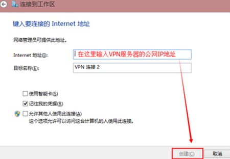 【控制面板】—-【网络和共享中心】—-选择【设置新的连接或网络】—-【连接到工作区】—-【下一步】—-【使用我的Internet连接(VPN)】—-在Internet地址处输入用户服务器的公网IP地址—-点击【创建】,如下图所示:
