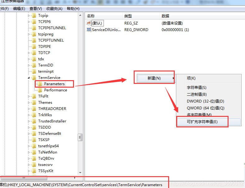 打开regedit,找到路径:HKEY_LOCAL_MACHINE\SYSTEM\CurrentControlSet\Services\TermService\Parameters
