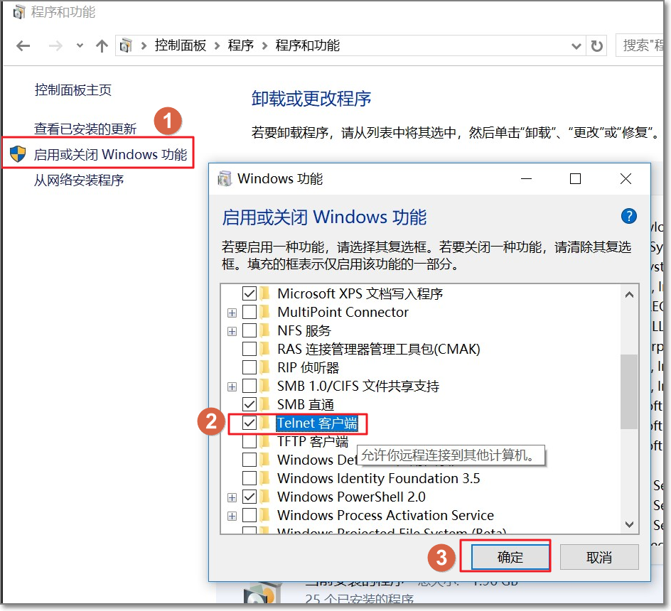 - 单击 启用或关闭 Windows 功能,勾选 Telnet 客户端,单击 确定。
