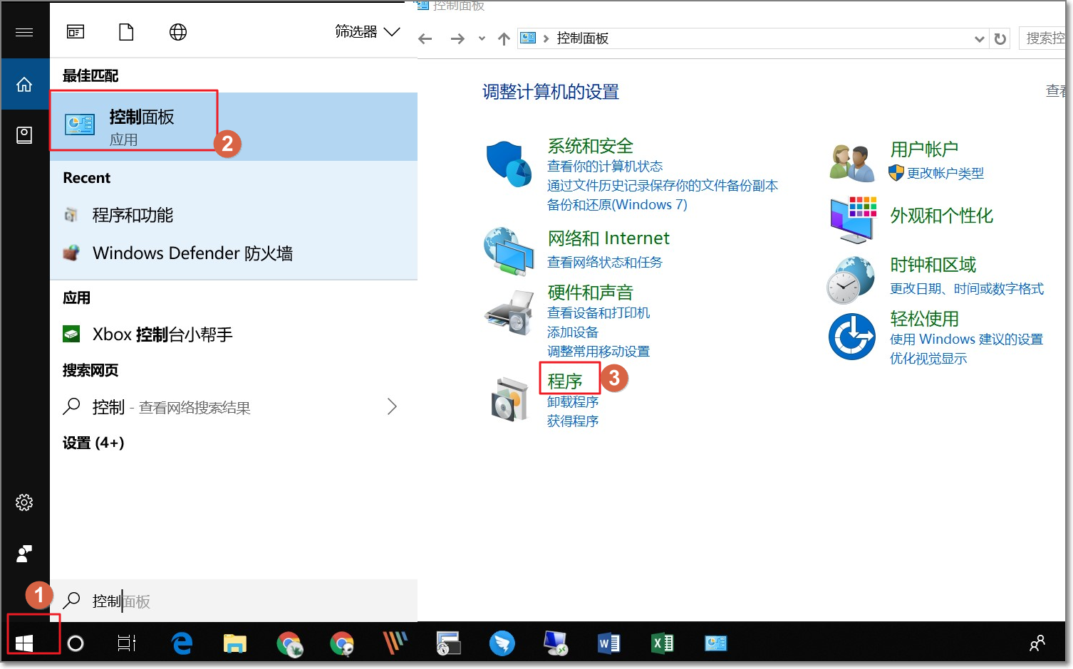 - 单击 开始,输入 控制面板 单击按钮 Enter,打开 控制面板 页面。
