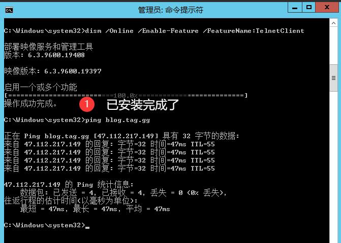 完成如图:dism /Online /Enable-Feature /FeatureName:TelnetClient