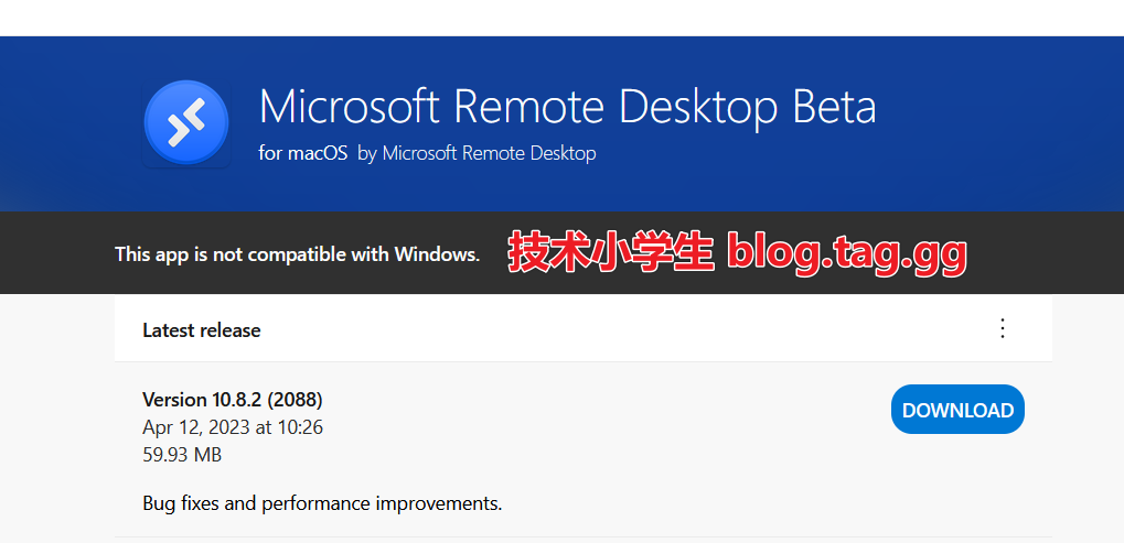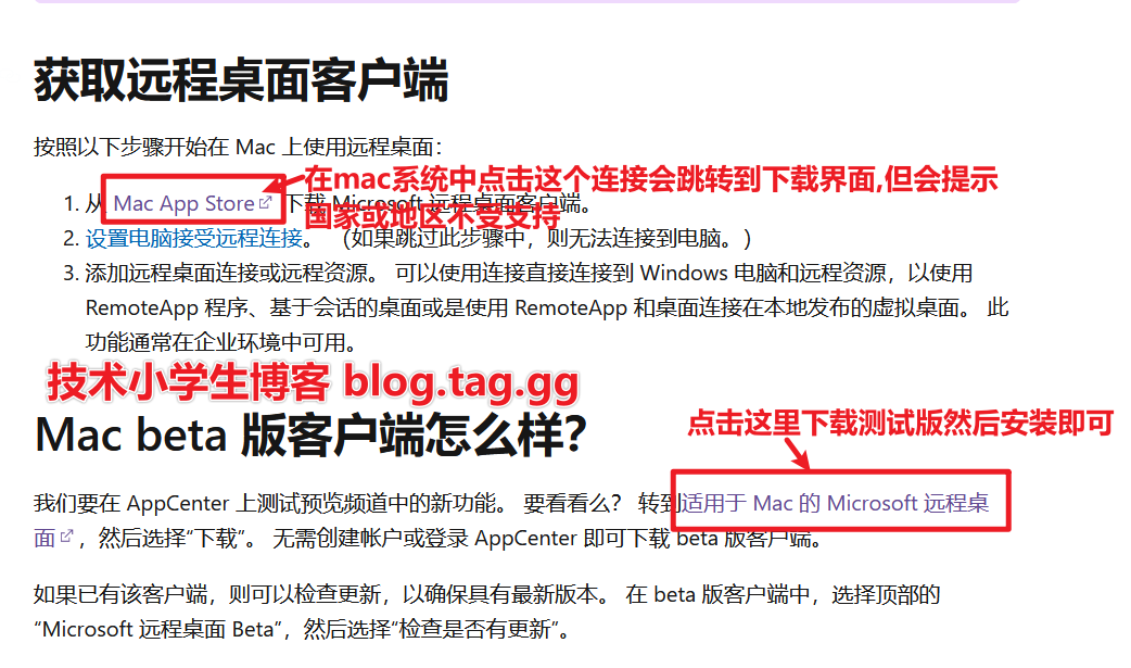 原因:微软说明文档中:https://learn.microsoft.com/zh-cn/windows-server/remote/remote-desktop-services/clients/remote-desktop-mac 有提供工具的下载地址,但访问后会提示"app不可用,目前您所在国家或地区尚不提供此APP"如图。无法搜索原因是您登录APP Store是中国大陆账号,目前苹果商店中在中国大陆中没有提供这个工具。 解决方法:微软文档看https://learn.microsoft.com/zh-cn/windows-server/remote/remote-desktop-services/clients/remote-desktop-mac 有提供测试版,尝试访问测试版可以直接下载,可以在mac电脑中访问:https://aka.ms/rdmacbeta 然后点击“download”即可下载,无需注册账号。下载后安装即可。
