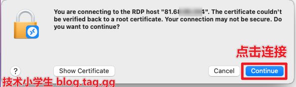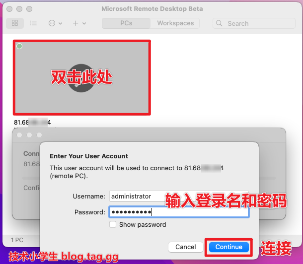 说明:远程端口为默认的3389,则只输入ip即可,如果您修改过远程端口,例如修改为了3359,则需要输入ip:3359(例如:81.68.68.68:3359) 3、添加后如图显示,双击红色区域即可连接,然后输入用户名和密码点击“Continue”连接。