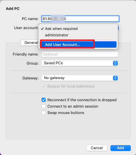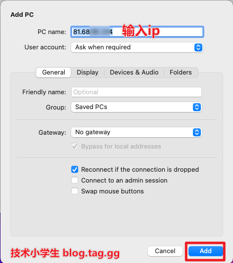 1、点击“Add PC”按钮,或点击“+”号下拉选择“Add PC”进行添加服务器,如图。 2、在“PC name”输入中输入连接的服务器ip