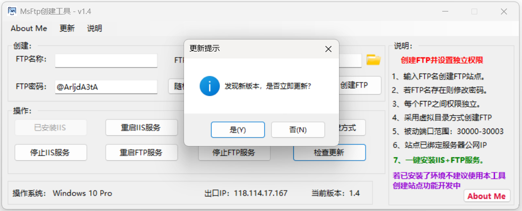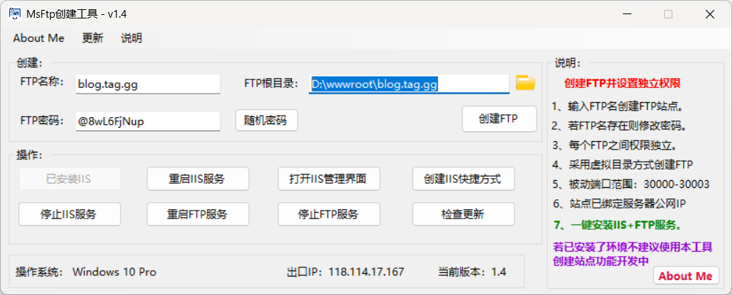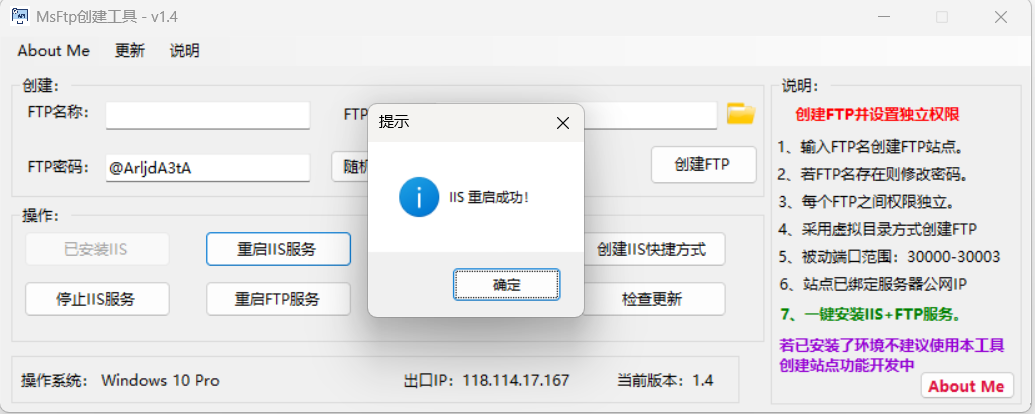 7、实现点击按钮重启IIS和FTP服务也支持点击停止服务。点击按钮打开IIS管理器,点击按钮创建IIS管理快捷方式到桌面。