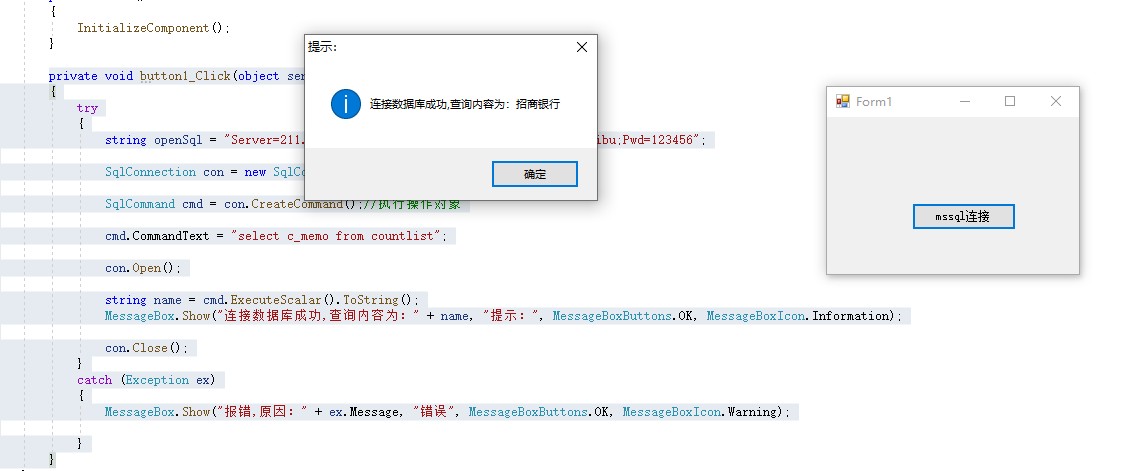 MessageBox.Show("连接数据库成功,查询内容为:" + name, "提示:", MessageBoxButtons.OK, MessageBoxIcon.Information);