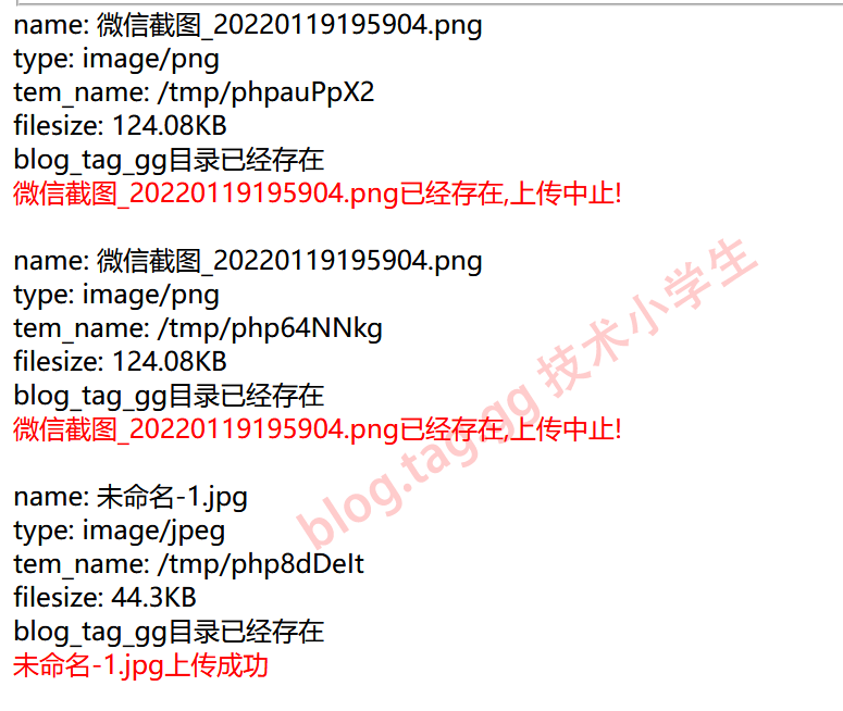 } else echo( '<font color=red >'.$filename[ $i ].'已经存在,上传中止!</font>'.'<br/><br/>' );