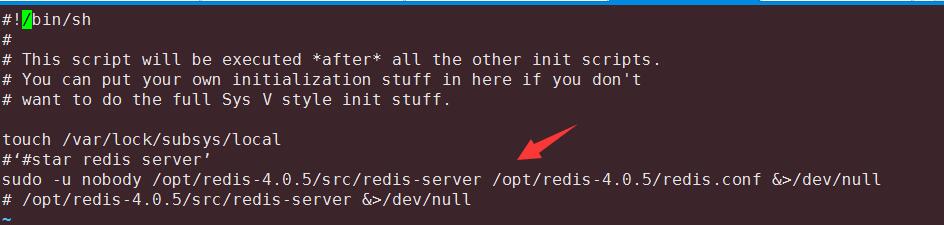 echo ‘sudo -u nobody /opt/redis-3.0.0/src/redis-server /opt/redis-3.0.0/redis.conf &> /dev/null’ >> /etc/rc.local