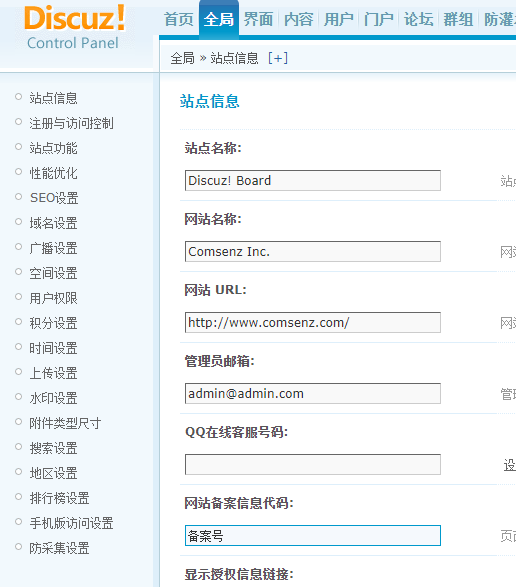 discuz程序设置备案号和dede一样,都是网站后台支持设置,在后台-全局-系统设置-备案号中设置即可
