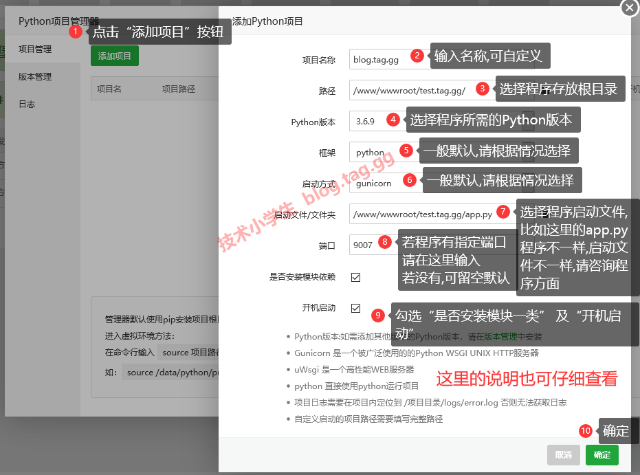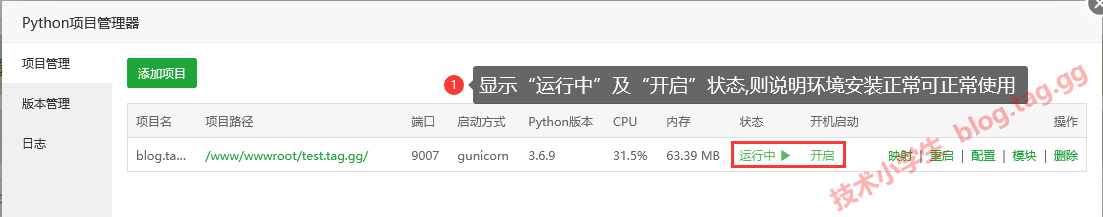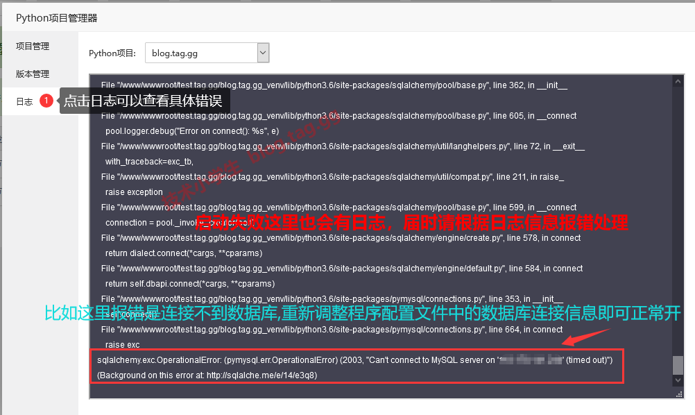 至此,宝塔支持Python网站环境搭建完毕,若访问报500错误,可以在“Python管理器”的日志中查看下具体报错,可根据报错来调整