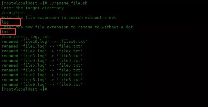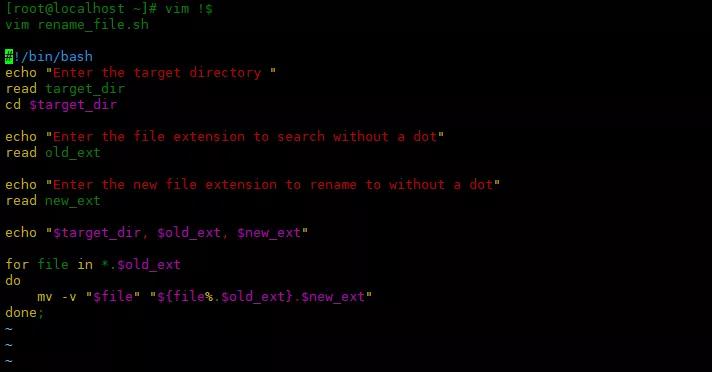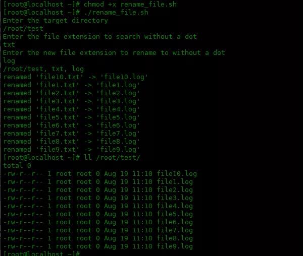 上面的脚本将询问用户要处理的目录,然后 cd 进入设置目录。接下来,我们得到没有点.的旧扩展名。最后,我们获得了新的扩展名来重命名文件。然后使用循环将旧的扩展名更改为新的扩展名。[root@localhost ~]# vim rename_file.sh