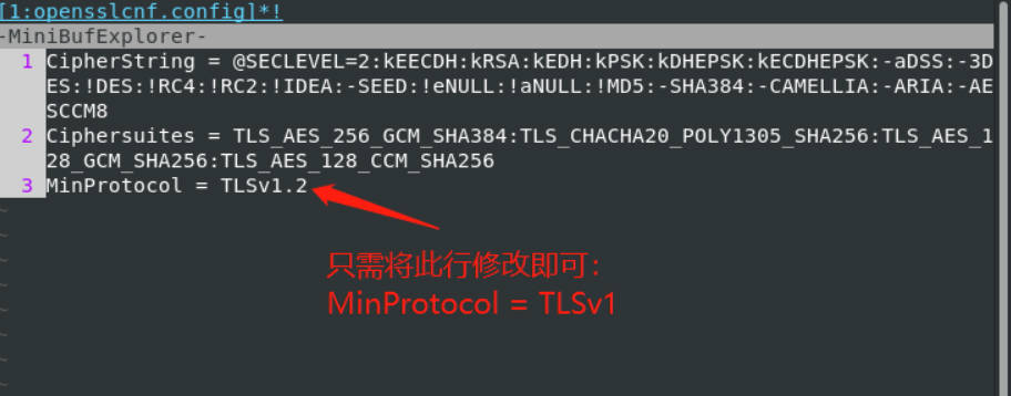 注意 MinProtocol 这里,填写TLSv1即可,不要填写TLSv1.0,否则无效。[default_conf]