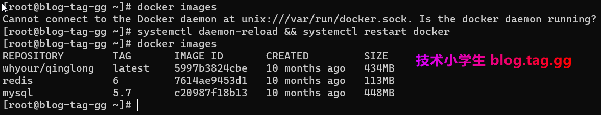 ◆◆0 解决docker报错:Cannot connect to the Docker daemon Is the docker daemon running?被墙跳转TG:@qianhenetwork QQ 851617266 来源: 2022-10-26 16:42:26 Linux 459 0 前言:重启服务器后在执行docker命令后报错:Cannot connect to the Docker daemon at unix:///var/run/docker.sock. Is the docker daemon running?本教程介绍这个报错的解决方法。 执行如下命令即可解决 systemctl daemon-reload && systemctl restart docker 声明:站长码字很辛苦啊,转载时请保留本声明及附带文章链接:https://blog.tag.gg/showinfo-3-36243-0.html 亲爱的:被墙域名跳转TG:@qianhenetwork QQ:851617266,可否收藏+评论+分享呢? 上一篇:最新qinglong青龙面板安装及全自动刷京东豆详细方法 下一篇:Docker容器中Mysql数据库主从同步搭建方法