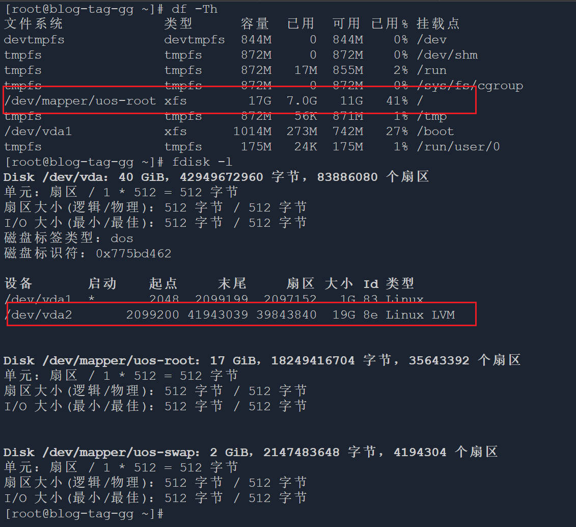 看下现在默认显示: 右上得知,确定是没扩容导致容量不一致,并且是逻辑卷,mbr分区格式,且是xfs文件系统。