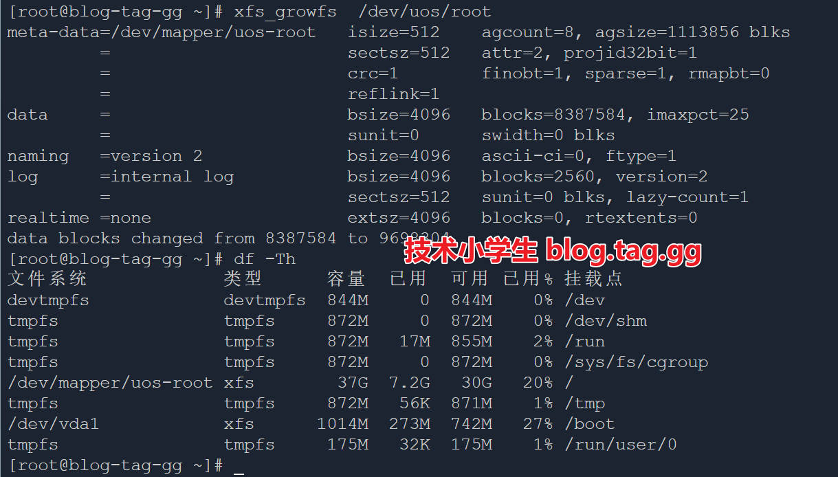 再执行命令扩容物理卷:[root@blog-tag-gg ~]# LC_ALL=en_US.UTF-8 growpart /dev/vda 2