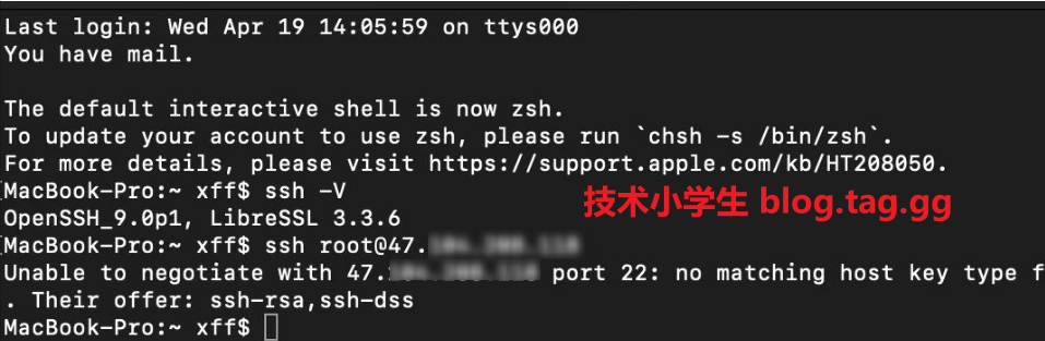 解决方法:The default interactive shell is now zsh.To update your account to use zsh,please runchsh -s /bin/zsh'For more details,please visit https://support.apple.com/kb/HT208050MacBook-Pro:~ xff$ ssh -VOpenSSH_9.0p1, LibreSSL 3.3.6MacBook-Pro:~xff$ ssh [email protected] Unable to negotiate with 47.104.0.0 port 22: no matching host key typeTheir offer: ssh-rsa,ssh-dss