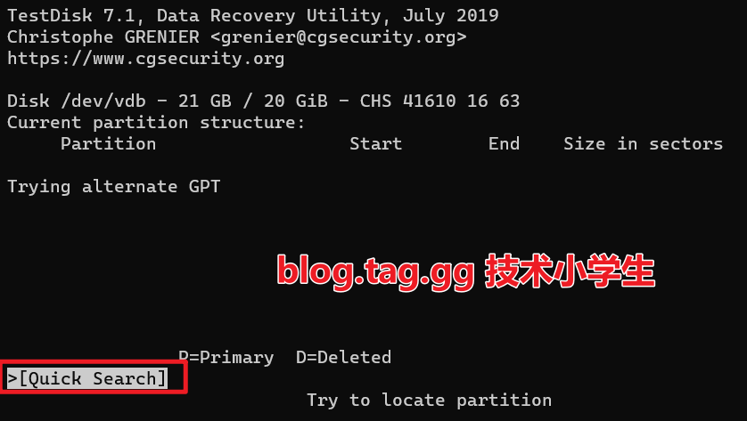 结果看是没有任何分区的,选择“Quick Search”后按回车键搜索一下分区。TestDisk 7.1, Data Recovery Utility, July 2019