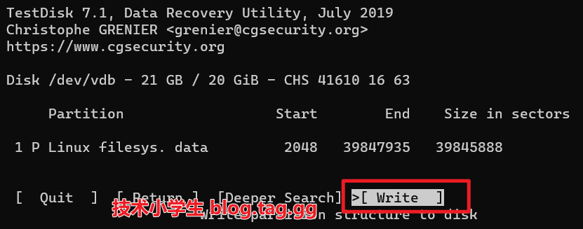 选中分区后,按回车键.然后用方向键移动选择“Write”即可保存分区。TestDisk 7.1, Data Recovery Utility, July 2019