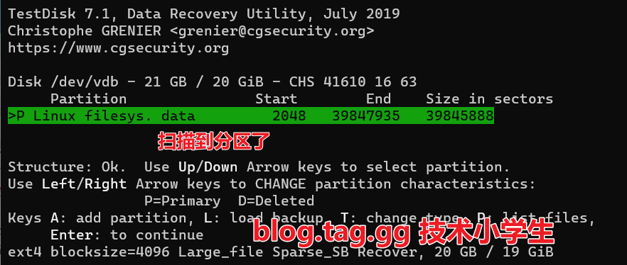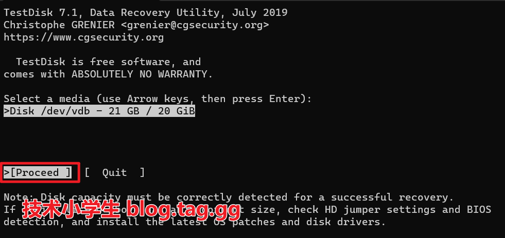 如图 选择“Proceed”回车,进入如下界面:TestDisk 7.1, Data Recovery Utility, July 2019
