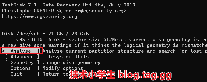 选择“Analyse”后按回车键。后显示如下TestDisk 7.1, Data Recovery Utility, July 2019