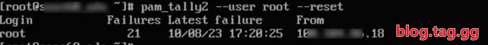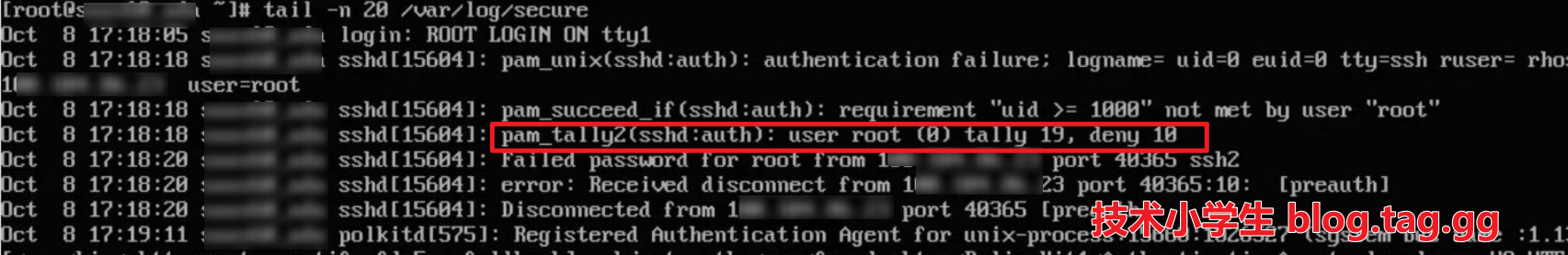 查看显示如图: 原因:通过日志看是root被锁定了,之前有安装 pam_tally2 模块配置过登录策略,例如限制每个用户最多尝试登录5次,在达到上限后锁定帐户,一般是在“/etc/pam.d/common-auth”或 /etc/pam.d/sshd 文件中增加“ auth required pam_tally2.so deny=5 unlock_time=1200”实现策略效果。tail -n 25 /var/log/secure