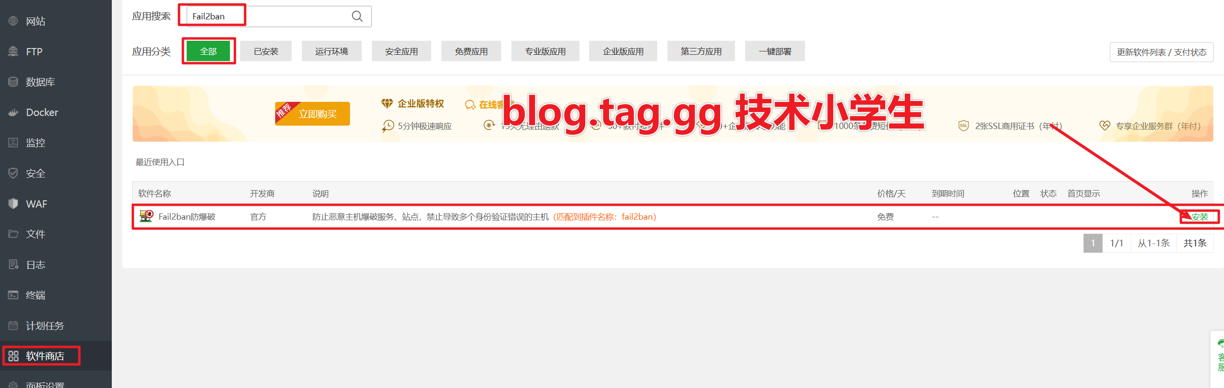 1、如果服务器是有安装宝塔面板,可在宝塔后台安装,如图。 2、手动安装“Fail2ban”: