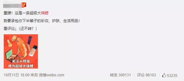 说到这就不得不聊一聊中国人的锦鲤情节了,转发锦鲤往往会跟“好运气”相关,就算活动的中奖概率很低,用户图个吉利也会转发参与下。