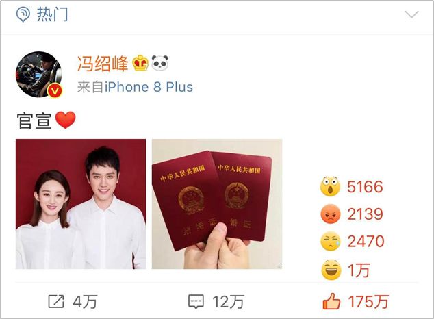 冯绍峰的婚讯微博转发 4 万,评论 12 万,点赞更是有 175 万之多。