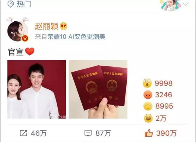 而赵丽颖的微博就更火爆了,转发 46 万,评论 87 万,点赞 390 万!