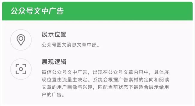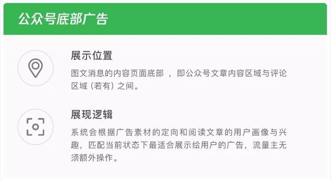微信广告公众号流量目前已开放底部广告、文中广告、互选广告三大流量位。公众号运营者开通流量主后,可选择接入底部广告、文中广告流量位,并通过获得邀请的方式开通互选广告位。公众号流量位根据需求可以灵活组合,底部广告收益筑底+文中广告收益提升+互选广告收益补充,可为运营者带来更可观的变现收益。