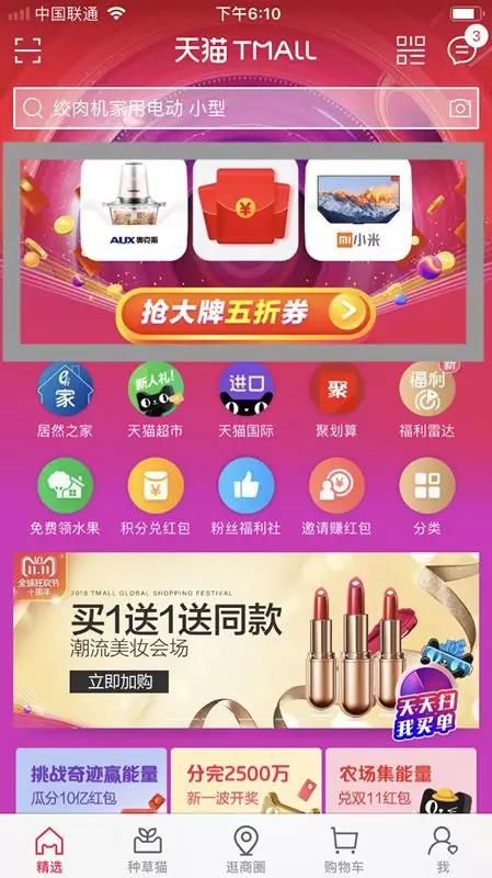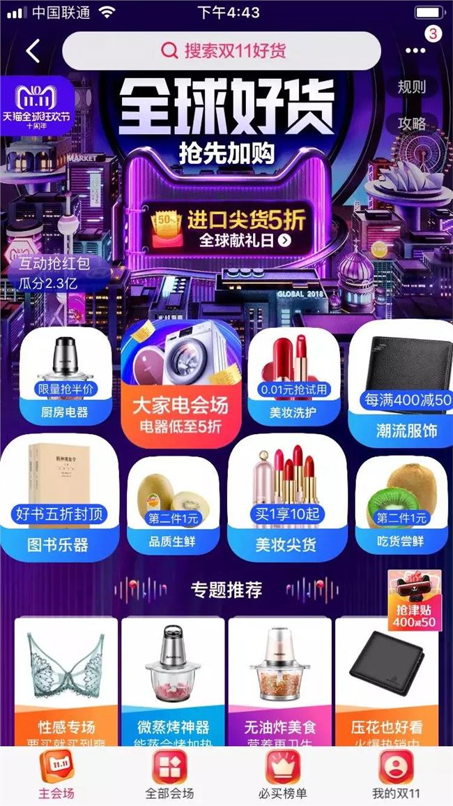 而承接流量的主会场是天猫与淘宝这两款产品中的二级页面。如果进入天猫或淘宝的话,点击顶部的banner,就可以跳转。