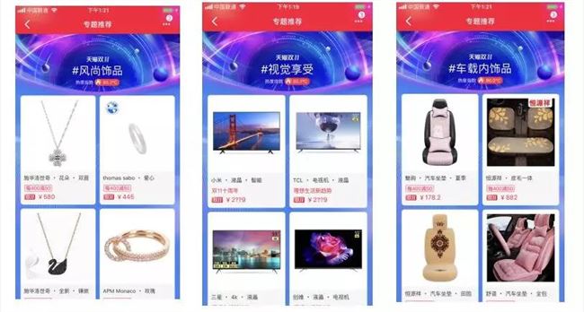 在分发上,天猫还设置了专题分发。类似地,专题也有很多专题,女装专题、饰品专题等。