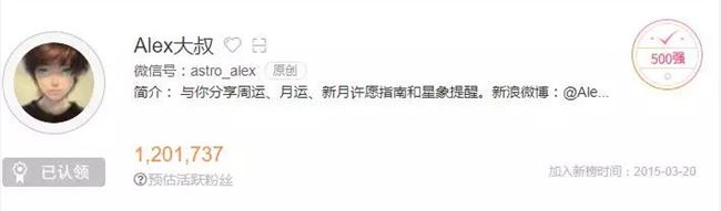从星座切入生活,给予读者关于生活、职场、学业、爱情等方面的分析解读,不满而立之年的神秘“大叔”Alex,目前已经在两微平台拥有共计近 1600 万粉丝,其中包括 1400 万+微博粉丝,以及 180 万+微信公号粉丝,并且仍在以稳定速度增长。